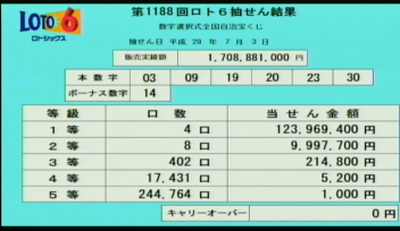 第1186回ロト6当選番号 >>
