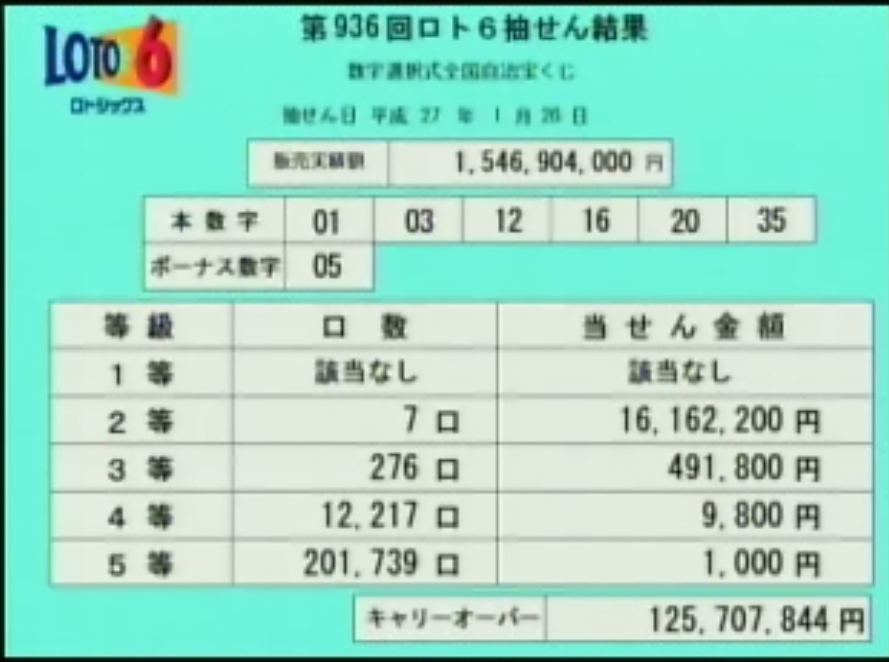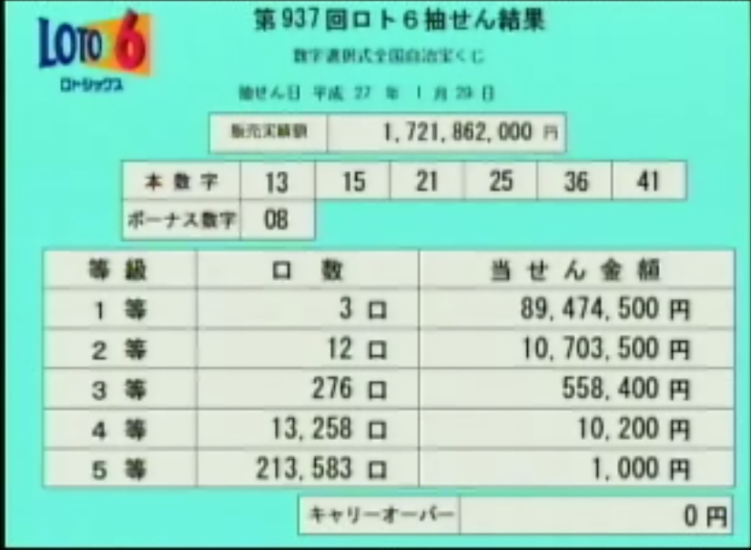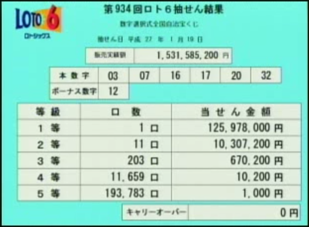 第934ロト6当選速報です