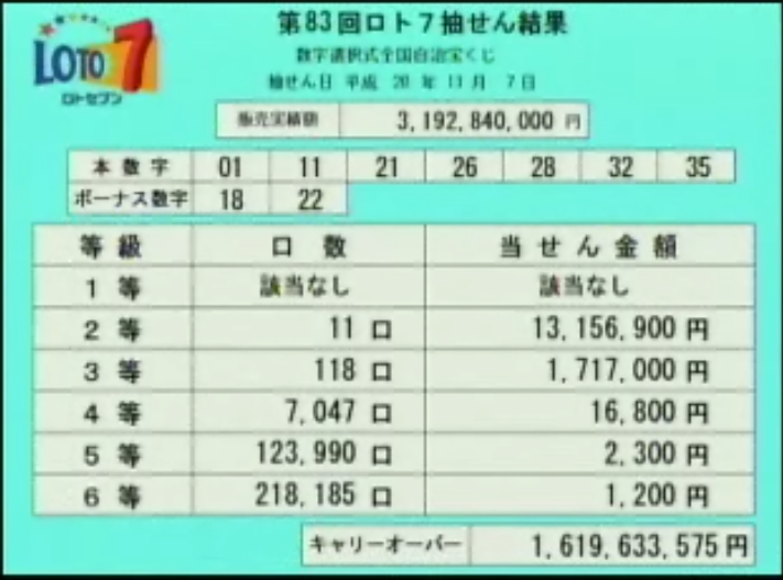ロト7はなんと5週連続当選者無しで、16億1千9百万円のキャリーオーバーとなりました。