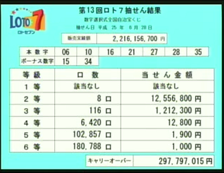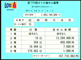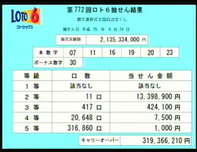 ちなみに1等が来た場合の当選予想金額は、6億チョットと予想するサイトが有りましたので、8億には届かない模様です。