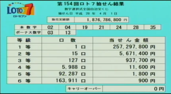 第154回ロト7当選速報