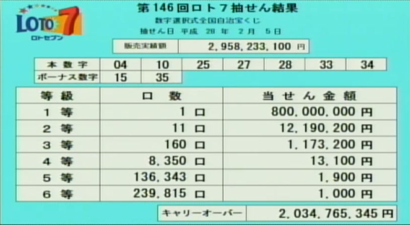 第146回ロト7当選金額