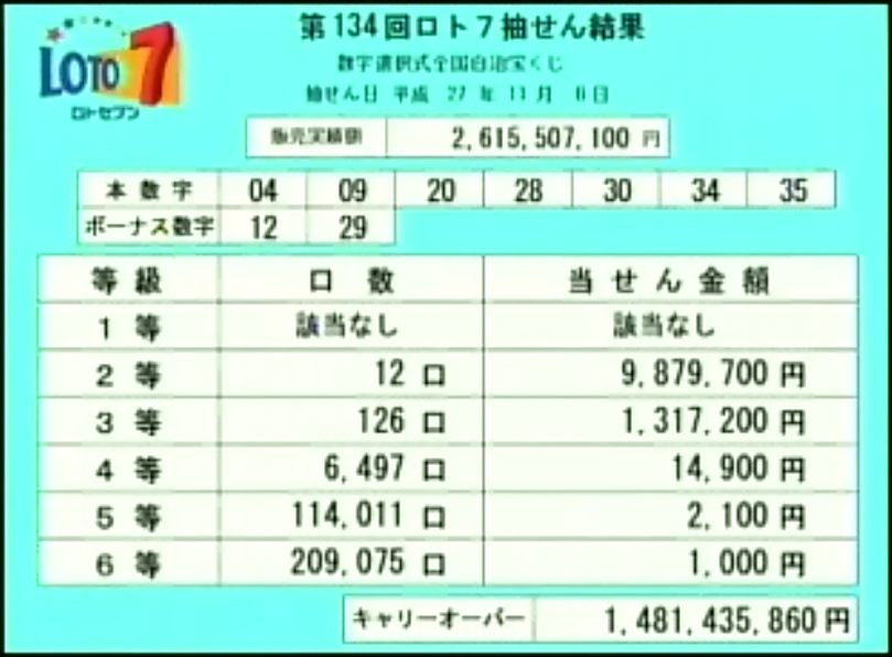 第134回ロト7当選速報