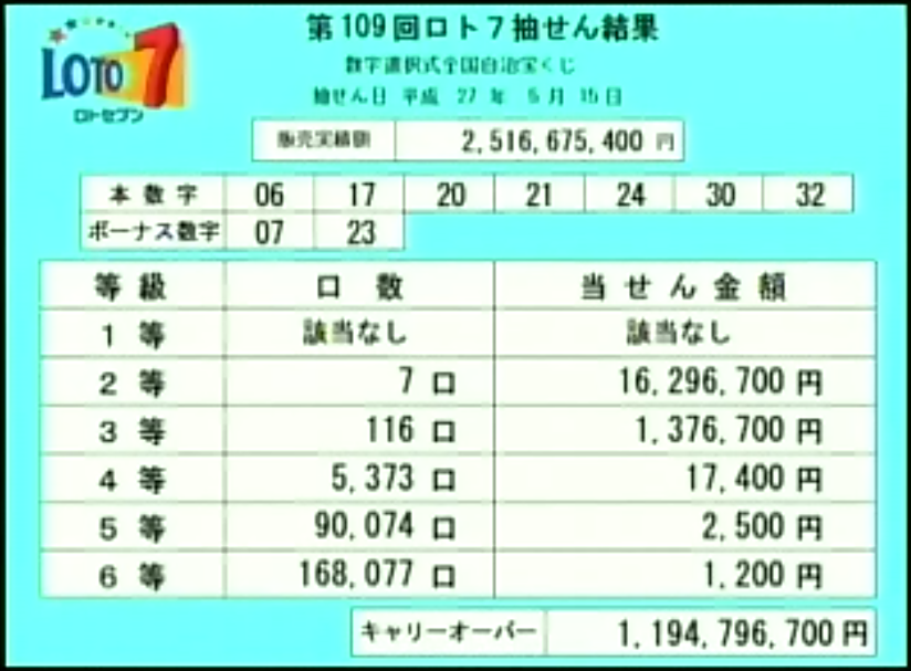 第109回ロト7当選速報